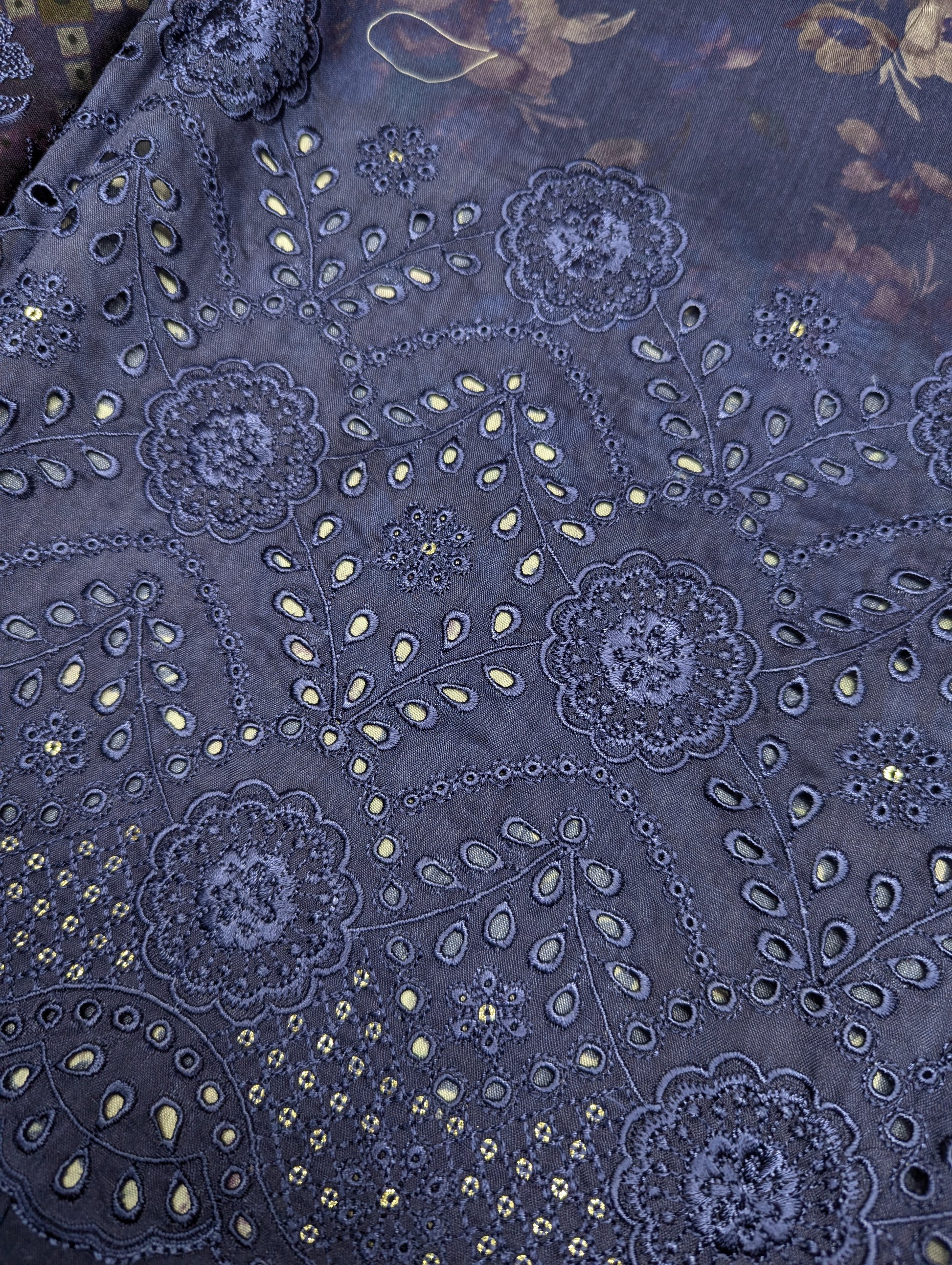 Long digital printed scelper embroidery shawl, enhanced with delicate embroidery and finished with two-sided lace, adding a graceful and polished touch.